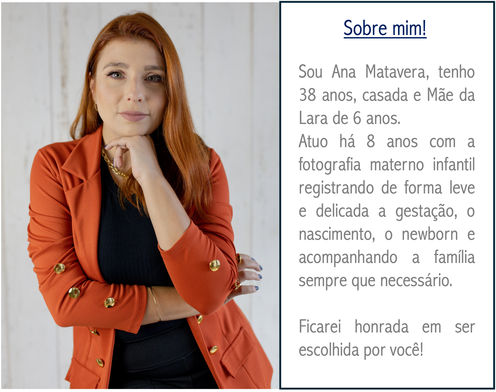 "O nascimento de um filho(a) é sem duvidas o momento mais mágico da nossa vida. O misto de emoção e medo toma conta do nosso coração. Mas em meio há tantas providencias que devemos tomar, a fotografia não pode ficar pra depois. É através dela que você se lembrará de todos os detalhes desse dia inesquecível!"